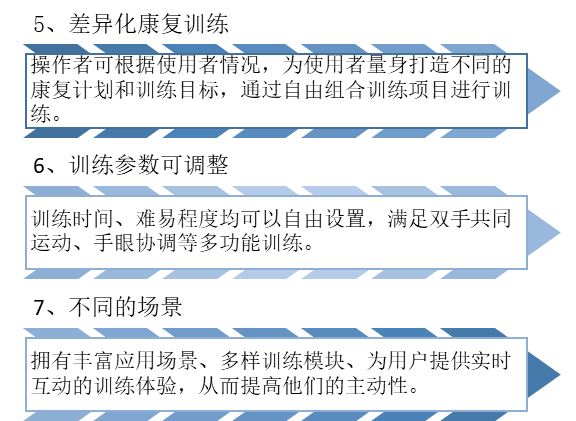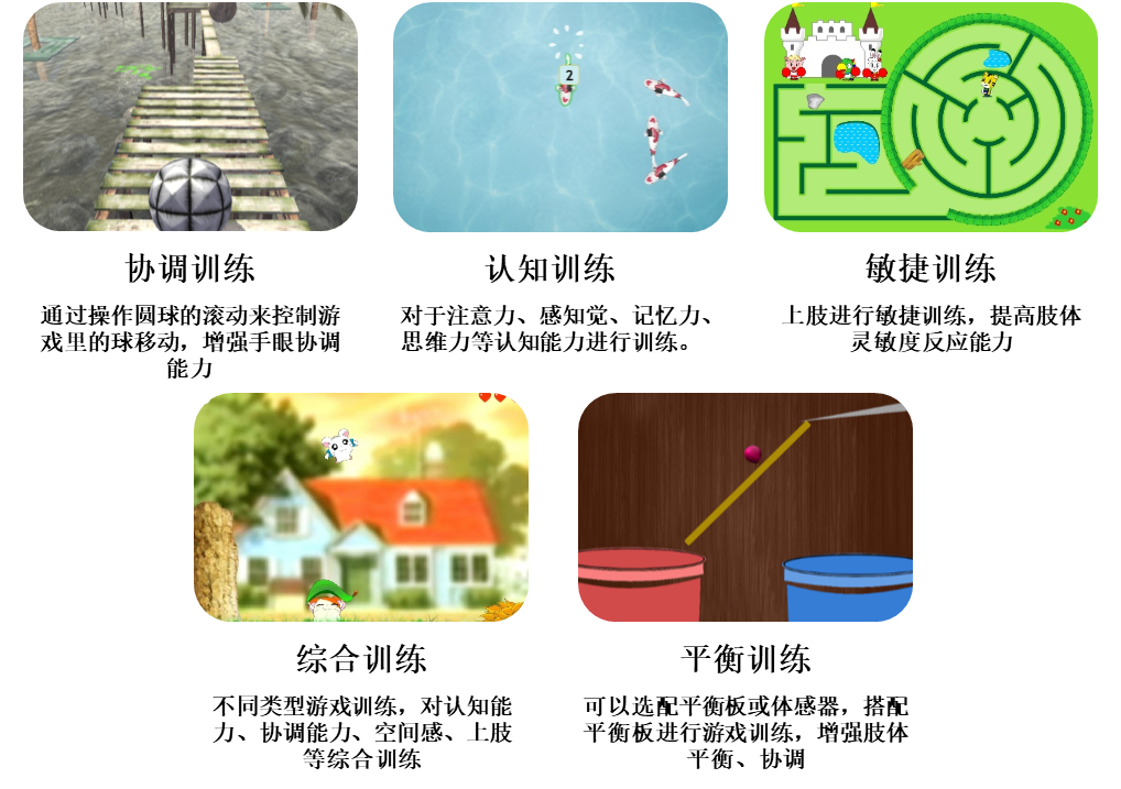 训练模块系统将运动、协调、认知、平衡等训练融合一起,达到肢体训练、认知训练,结合虚拟情景方式,训练疗效突出。